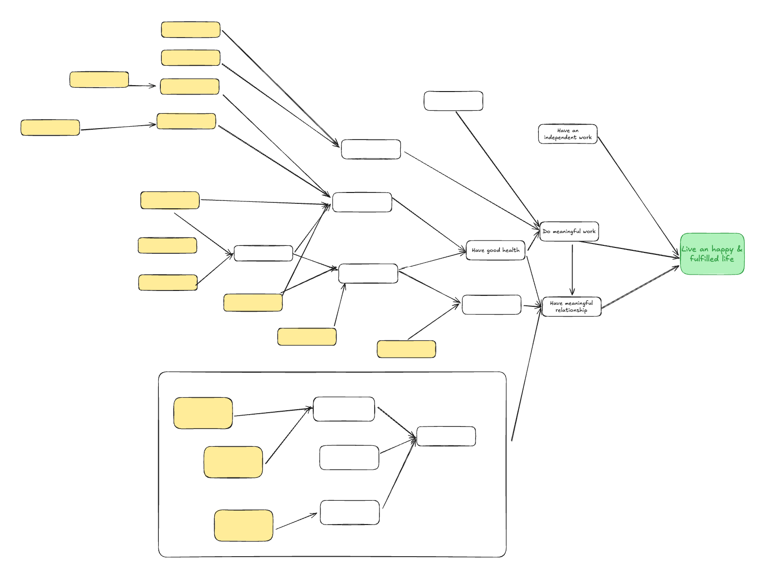 Và cứ đi ngược lại như vậy, mình đã vẽ được một bản đồ hệ thống full của mình, một "causal model" của bản thân. Nó trông như thế này: